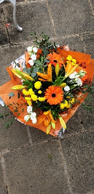 Orange lillies and orange gerbers together with bright yellow chrysanthemums and foilages. A tropical feeling bouquet.